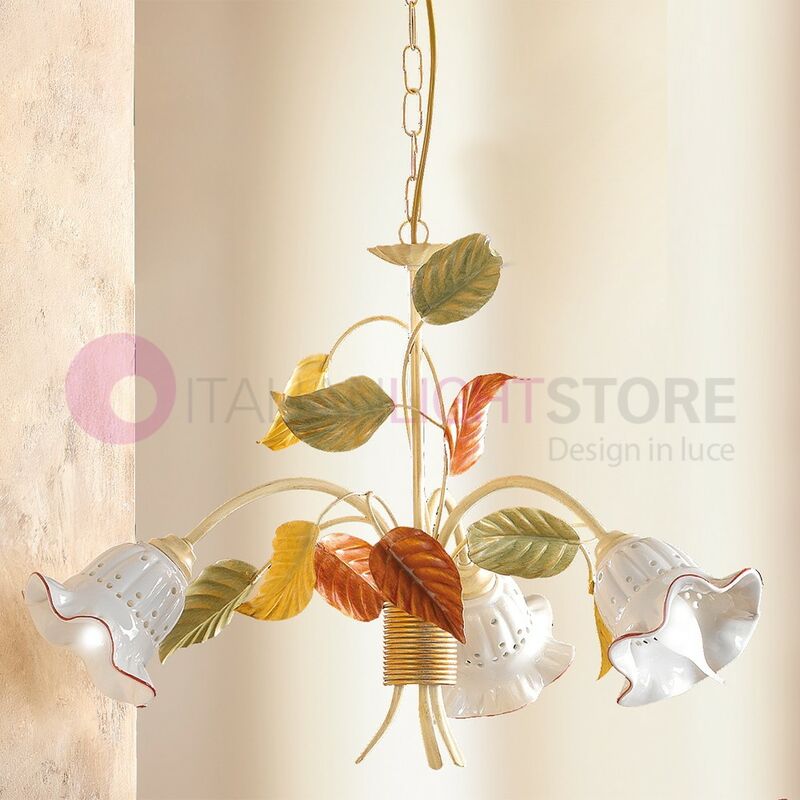 Lampadario sospeso in ferro battuto decorato e diffusori in ceramica bianca traforata con bordino colorato. Lampadario a sospensione a 3 luci in stile classico rustico country, collezione Campiglia di Ceramiche Borso . La lampada ha diffusori in ceramica bianca lucida traforata, arricchita da eleganti bordini rossi colorati a mano. Originale struttura in ferro sagomato e saldato, verniciata avorio e rifinita a mano con sfumature oro e colori pastello che richiamano lo stile fiorentino;