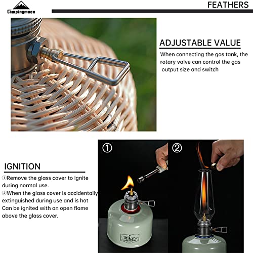 Campingmoon lanterna a gas da campeggio, utilizza gas isobutano come combustibile (gas combustibile non incluso). Questa lanterna a gas può essere utilizzata su una bombola di carburante isobutano con attacco a vite (bombola di gas tipo EN417 Lindal Valvola).