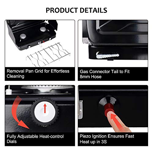 ➤ Alta efficienza energetica: la stufa a gas Camplux JK-8620 ha una potenza termica fino a 2,4 kW (2 bruciatori in acciaio inox da 1,2 kW). Riscaldamento rapido in 3 secondi con accensione piezoelettrica integrata per un'illuminazione affidabile e senza corrispondenze. Il controllo individuale del calore per ogni bruciatore offre una potenza di cottura precisa, dalla cottura a fuoco lento fino a bollire profonda.