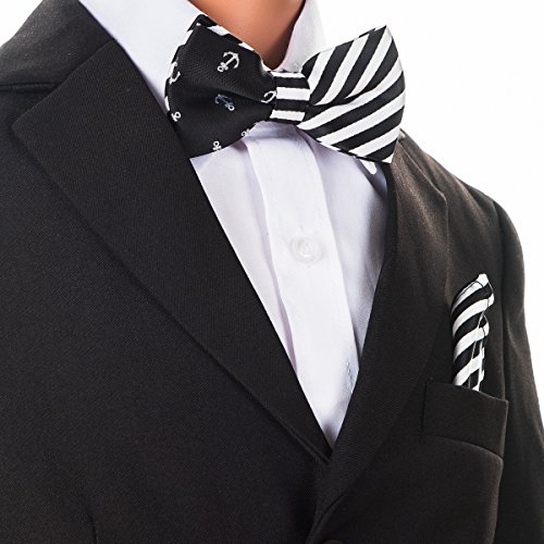 100% poliestere in microfibra pre-legato Boy' s Bow Tie, con chiusura a strappo regolabile al collo e nella parte posteriore, disponibile in 4 misure. Sono forniti con una confezione regalo con una tasca corrispondenza Square. Istruzioni per la cura: lavare a mano con cura.