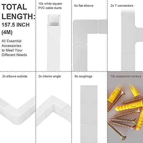 [Cosa ottieni] Compresi 10 condotti per cavi in PVC quadrati bianchi e ciascuno dei nostri condotti per la gestione dei cavi misura 15,75 x 0,78 x 0,39 pollici (LxPxA);