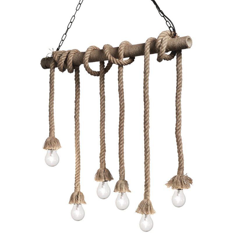 Montatura in metallo verniciato. Cavi elettrici e diffusori rivestiti in corda di canapa naturale. L 80 x H min 130 / max 153 x P 5 cm max 6 x 15W E27 IP:20