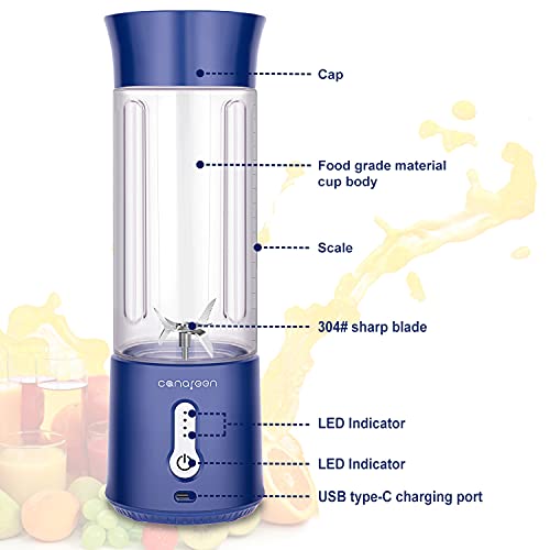 Canareen Frullatore Elettrico Frullatore Portatile - Blender da 500ml per frullati e succhi | Mini frullatore smoothie USB ricaricabile da 4000 mAh con 6 lame per palestra sportiva da viaggio (Blu)