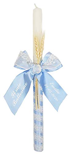 Fatto in cera bianca e dettagli de spiga, fiocco celeste, merletto valencié e il messaggio “Il mio battesimo” ricamato. Dimensioni: 35 x 2,5 cm. 100% fabbricati artigianalmente in Spagna con le migliori rifiniture e qualità.