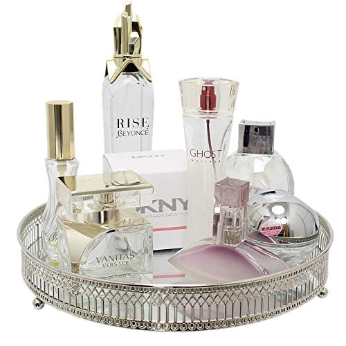 Base per candela decorativa, antica, di color argento, in metallo, dotata di uno specchio sul fondo