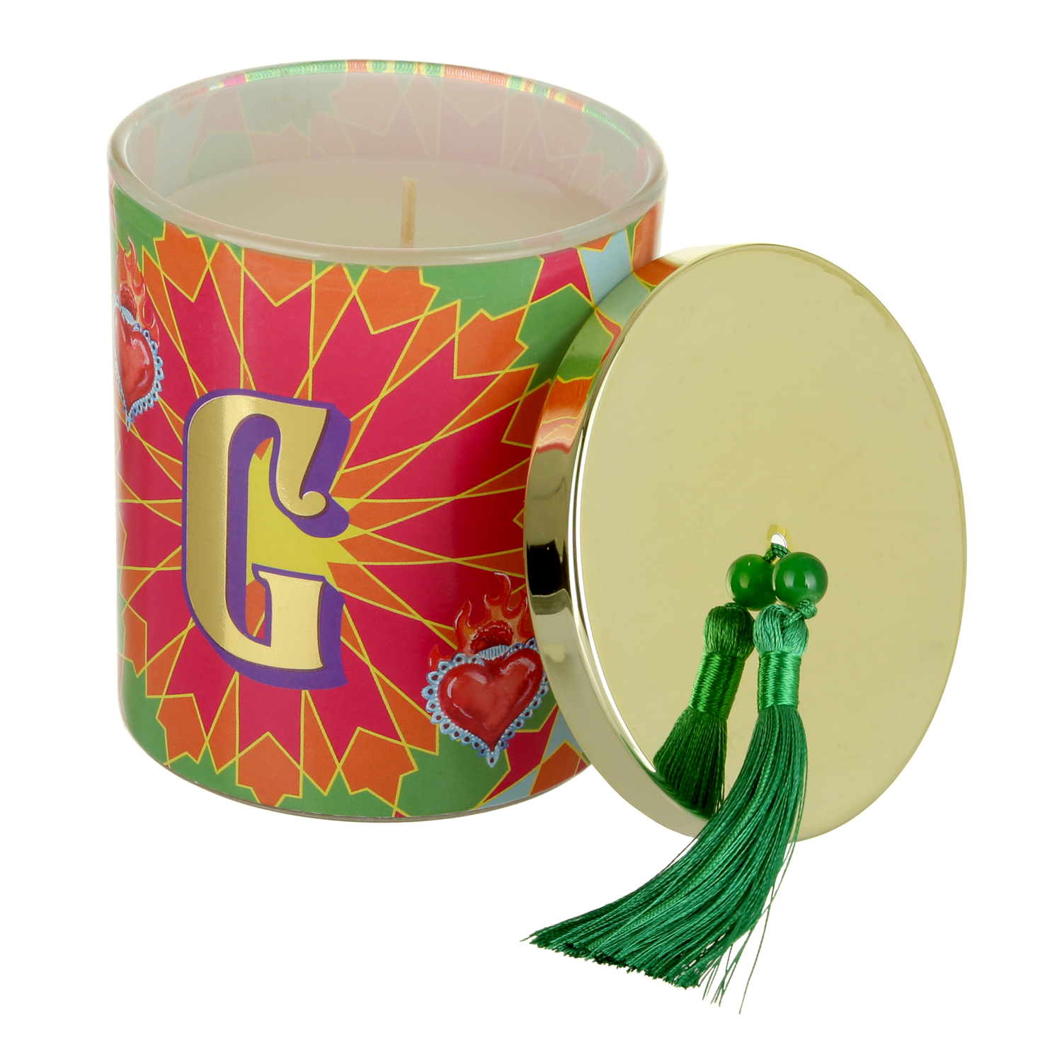 La linea di candele profumate firmate dalla designer Benny Setti è perfetta per portare il piacere dell'aromaterapia direttamente a casa tua. Il barattolo in vetro decorato a tema circo con lettera G, combinato a un coperchio dorato con nappina colorata, rende questa candela profumata un vero e proprio complemento d'arredo originale e alla moda. La sua fragranza ti accompagnerà nei momenti di puro relax cullandoti con fresche note per la casa. Profumazione: Five Star. Dimensioni: 8x9 cm.