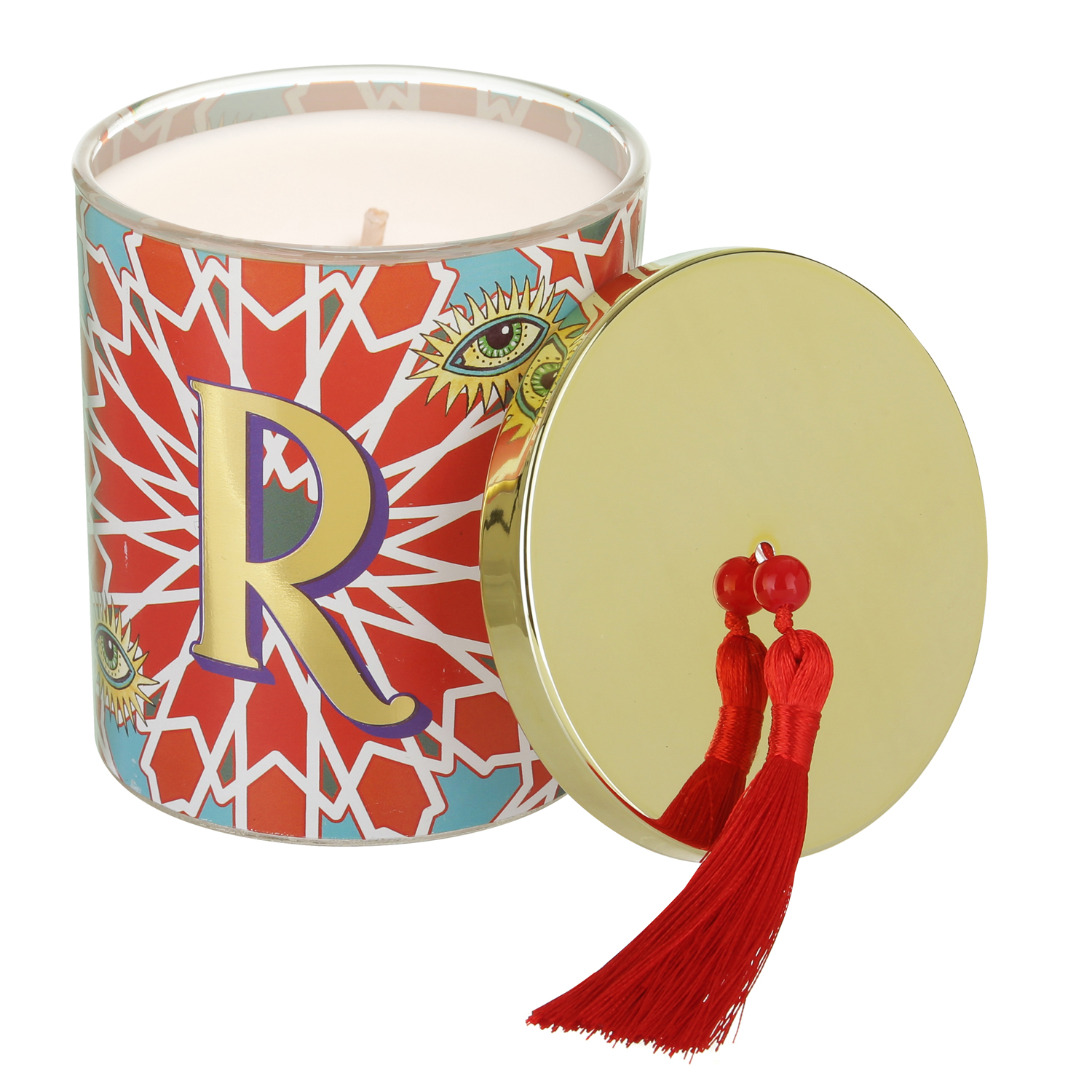 La linea di candele profumate firmate dalla designer Benny Setti è perfetta per portare il piacere dell'aromaterapia direttamente a casa tua. Il barattolo in vetro decorato a tema circo con lettera R, combinato a un coperchio dorato con nappina colorata, rende questa candela profumata un vero e proprio complemento d'arredo originale e alla moda. La sua fragranza ti accompagnerà nei momenti di puro relax cullandoti con fresche e dolci note floreali. Profumazione: incanto fiorito. Dimensioni: 8x9 cm.