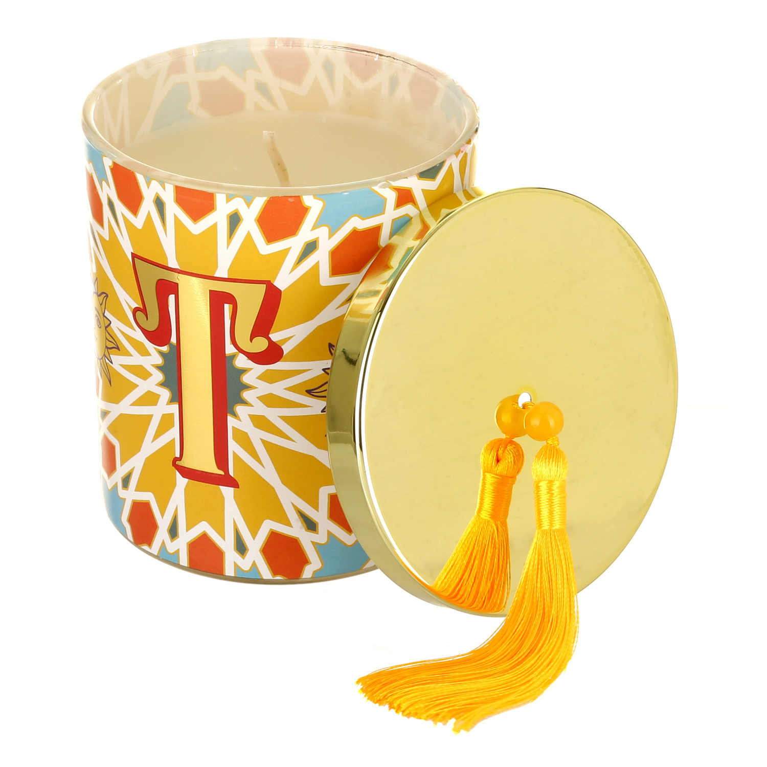La linea di candele profumate firmate dalla designer Benny Setti è perfetta per portare il piacere dell'aromaterapia direttamente a casa tua. Il barattolo in vetro decorato a tema circo con lettera T combinato a un coperchio dorato con nappina colorata, rende questa candela profumata un vero e proprio complemento d'arredo originale e alla moda. La sua fragranza ti accompagnerà nei momenti di puro relax cullandoti con fresche note per la casa. Profumazione: Five Star. Dimensioni: 8x9 cm.