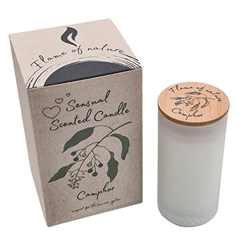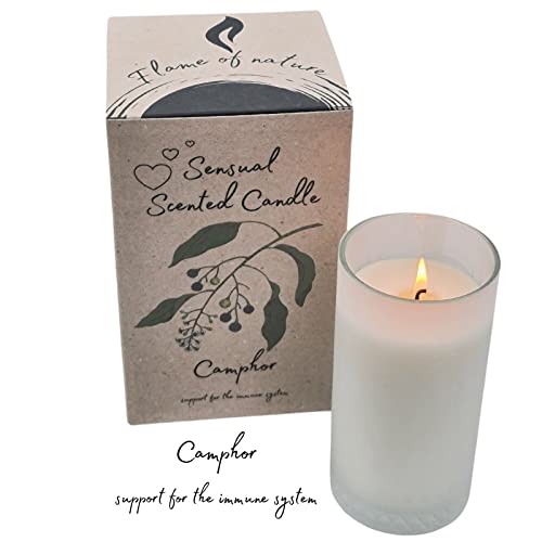 Candela profumata sensuale “FLAME OF NATURE - CANFORA” in un vasetto di cristallo, a base di cera di soia e olio essenziale 100% naturale per l'aromaterapia, la crescita spirituale e il benessere