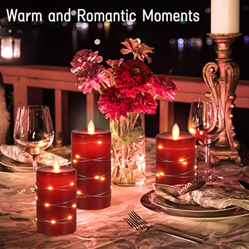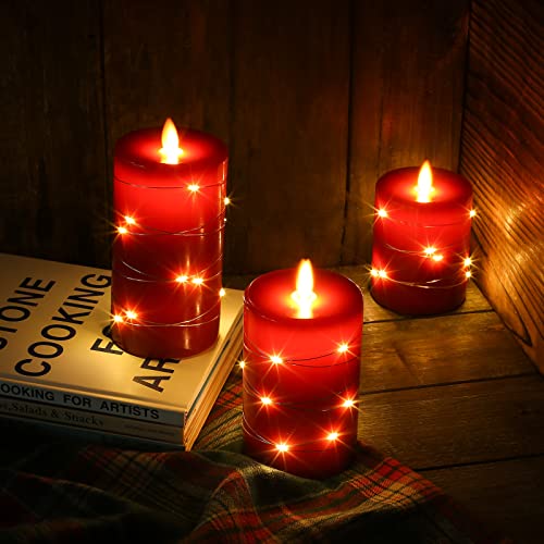 Candele LED Angolo di visione a 360 gradi, con luci stellate, 3 pezzi di candele a LED con telecomando a 10 tasti, funzione timer 24 ore, fiamma danzante, cera reale (Rosso).