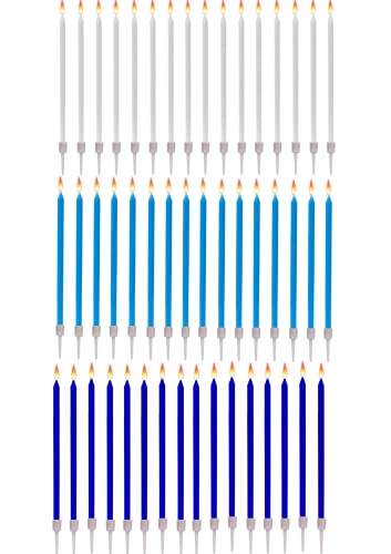 Candele di compleanno lunghe e sottili con supporti - Grandi 12 cm x 0,5 cm (48 candeline di compleanno, bianco - azzurro - blu scuro)