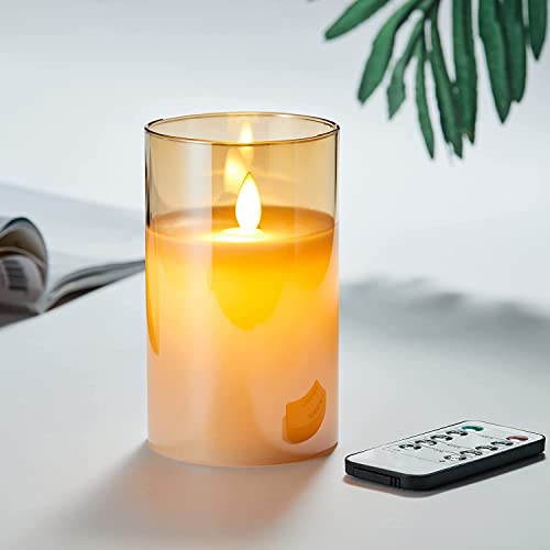 Candele LED, Flickering Flameless Candele, Candele a Batteria with Glass con Telecomando a 10 Tasti, Realizzato in Vera Paraffina,con Funzione Timer 24 Ore per Decorazione, Festa, Vacanze-15cm Marrone