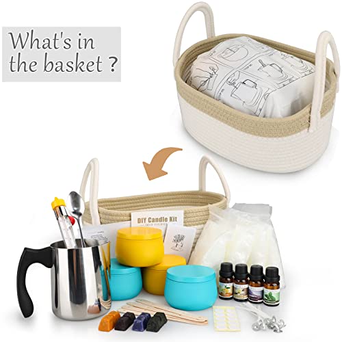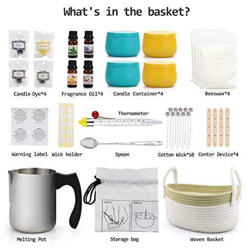 【Kit per candele fai-da-te all-in-one】 Include 4 * 200 g di cera d'api (800 g in totale), 1 * fornello, 1 * cucchiaio per mescolare, 1 * termometro, 4 * barattoli di candele (barattolo di cera blu * 2 + barattolo di cera gialla * 2). 4 * olio essenziale, 1 * confezione regalo, 4 * blocchi coloranti, 4 * porta stoppini, 10 * stoppini di cotone, 10 * punti di colla, 4 * adesivi fai-da-te, 1 * manuale utente, cesto tessuto * 1. Ottimo per i principianti