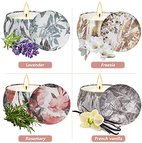 Candele Profumate Set da 4 Pezzi in Latta Decorativa 500g Cera di Soia per Stanza con Lavanda, Rosmarino e Vaniglia, Bruciare a 120 ore, Regalo per Donna Fidanzata Compleanno o Festa Della Mamma