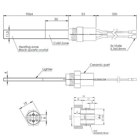 Esecuzione con raccordo filettato 3/8" GAS, versione forata, diametro 11,5x4mm, lunghezza totale 123mm, lunghezza sottobattuta 90mm, 300Watt, temperatura massima 1000°C.