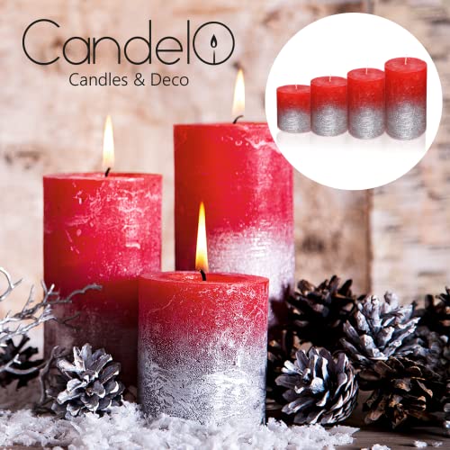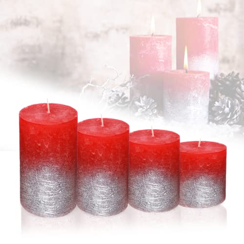 Candelo - Set di 4 candele rustiche, ambiente natalizio, corona dell'Avvento, rustico, colore rosso, argento metallizzato, 8/10/12/14 cm, candela di Natale