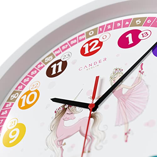 Cander Berlin MNU 1730, orologio da parete per bambini, unicorno e principessa, silenzioso, 30,5 cm, rosa, per imparare a leggere l'ora