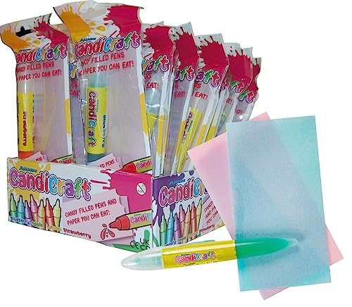 Display con 24 pezzi. Ogni unità contiene una penna a sfera riempita con caramello liquido e un sacchetto con due fogli di carta commestibile (wafer)