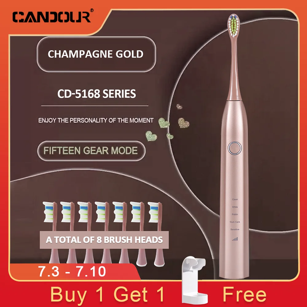 CANDOUR CD-5168 Sonic Electric Toothbrush Rechargeable Toothbrush IPX8 Waterproof 15 Mode USB Charger Replacement Heads Set