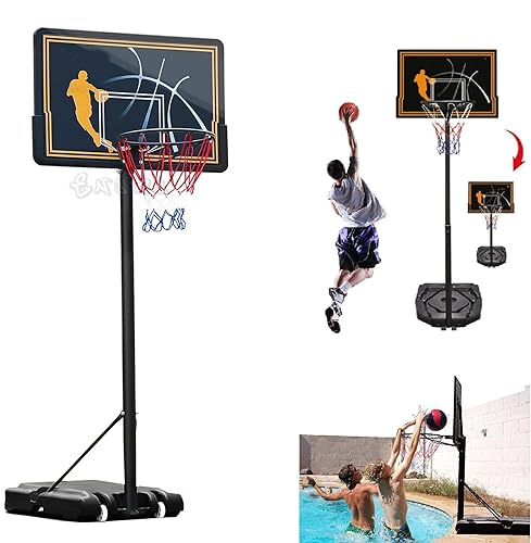 Canestro basket con piantana altezza regolabile, altezza minima 140 cm, altezza massima 250 cm, canestro per adulti e bambini. Il cerchio è in metallo diametro 38 cm. Altezza anello: 100 - 200 cm. Misure del tabellone: 73 x 49 cm. Misure complessive: 73 x49x 250 cm. La base è zavorrabile: capienza 30 kg sabbia (o acqua) + alloggio per sacco 70 kg sabbia (NON INCLUSI).