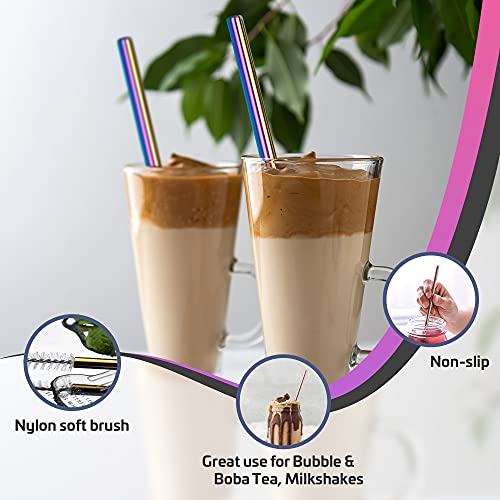 GODETEVI LE VOSTRE BEVANDE PREFERITE Agita le cannucce. 5 cannucce di metallo colorate (oro, oro rosa, blu, arcobaleno, nero). La dimensione della paglia è 21.5 x 1.2 x 1.2 cm. Include 1 spazzola per la pulizia e una custodia di lusso con marchio. Queste cannucce sono ideali per tè a bolle e boba, frullati, frullati, frappè, frappè, granite, frappé, yogurt, ecc.