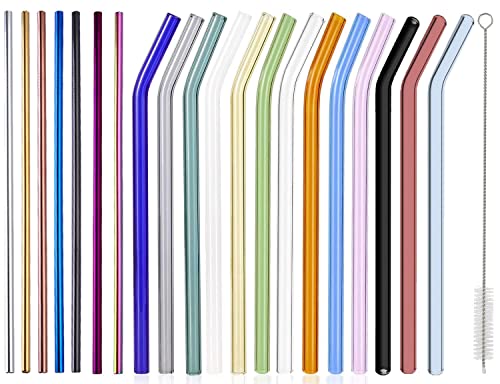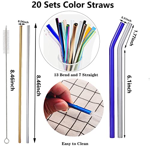 20 Pcs Cannucce Riutilizzabili in Vetro e Acciaio Inossidabile, 13 Colori Cannucce Curve in Vetro, 7 Colori Cannuccia Dritta in Acciaio Inossidabile per Cannucce, Frullatii, Frappè, Cocktail, Succhi