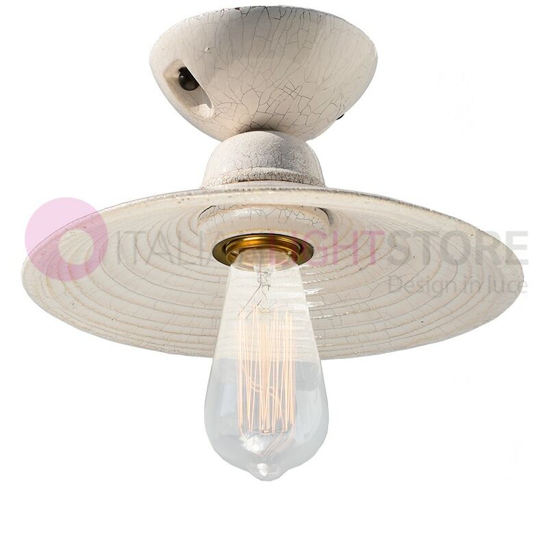 Plafoniera a soffitto in ceramica anticata, piatto d. 26 cm, stile Rustico Country. Plafoniera Lampadario a Soffitto con piatto in ceramica finitura bianco anticato. La lampada si inserisce con stile in ambienti rustici, rurali e country. Una particolare ed esclusiva lavorazione artigianale crea delle crepe, dei buchini, delle macchie nere sulla ceramica, dandogli un aspetto volutamente anticato e rovinato, e questo rende ogni pezzo un elemento unico e mai uguale agli altri;