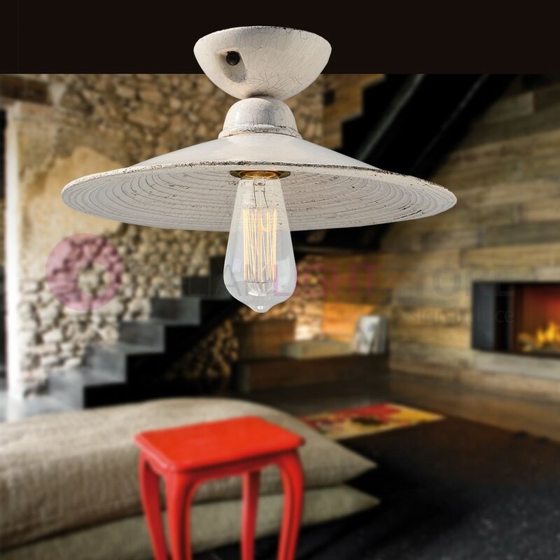 Plafoniera a soffitto in ceramica anticata, piatto d. 34 cm, stile Rustico Country. Plafoniera Lampadario a Soffitto con piatto in ceramica finitura bianco anticato . La lampada si inserisce con stile in ambienti rustici, rurali e country. Una particolare ed esclusiva lavorazione artigianale crea delle crepe, dei buchini, delle macchie nere sulla ceramica, dandogli un aspetto volutamente anticato e rovinato, e questo rende ogni pezzo un elemento unico e mai uguale agli altri;
