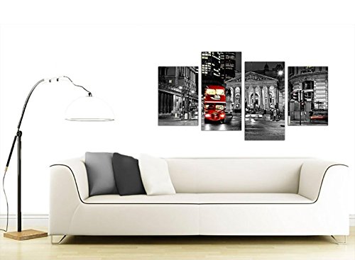 Canvas Prints of a Red London Night Bus on a Black and White Background for your Living Room - Cheap 4 Part British City Wall Art - 4208 - Wallfillers® by Wallfillers