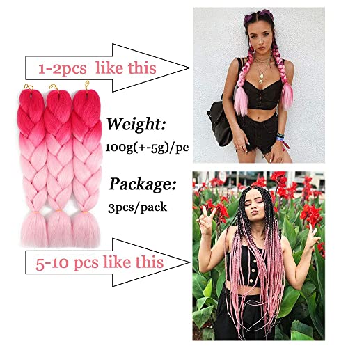 Capelli intrecciati Kanekalon Ombre Jumbo treccia 61 cm, 3 confezioni di extension professionali per donne intrecciate trecce sintetiche (magenta - rosa chiaro)