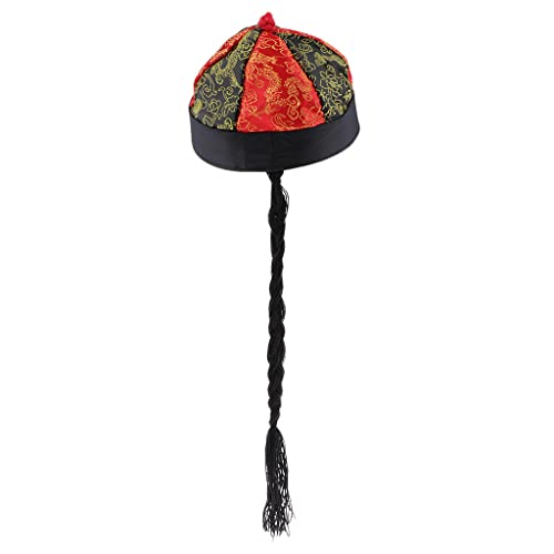 Cappello Da Imperatore Cinese con Trecce Lunghe Multicolori Cappello di Panno di Ruolo per Bambini, Rosso + Nero, 53 centimetri