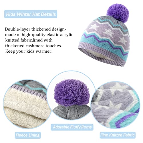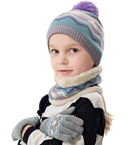 H&H Set di cappello, sciarpa e guanti per ragazze e ragazzi 3-8 berretto in maglia foderato in pile con guanti touchscreen con pompon inverno e sciarpa ad anello per bambini (Viola/Verde menta)