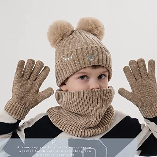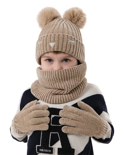 H Set cappello, sciarpa e guanti per ragazze e ragazzi dai 5 ai 10 anni con un berretto spesso foderato in pile con due pompon, guanti touchscreen, sciarpa invernale e loop, bambini