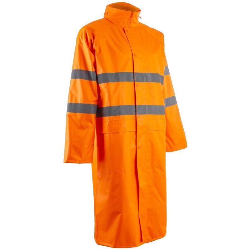 Caratteristiche: Cuciture nastrate Cappuccio fisso integrato nel collo con zip + coulisse Collo alto Chiusura centrale con zip sotto patta con bottone a pressione Maniche raglan Polsini elasticizzati antivento 2 tasche inferiori con patta Retro ventilato Asole di aerazione sotto le ascelle Cinturini cuciti: 2 cinture + 2 bracciali/manica Lunghezza: 120 cm STRISCE RETRORIFLETTENTI: Strisce di microsfere cucite: 5 cm Composizione: OXFORD: 100% poliestere rivestito in poliuretano - 150D Standard: GATTO DPI. II;