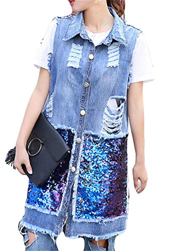 Cappotto Jeans Donna Lunga Strappato Cavo Paillettes Gilet Jeans Eleganti Smanicato Bavero Grazioso Allentato Moda Baggy Prodotto Plus Denim Giacca Donna Gilet Stlie (Color: Blau, Size: L)