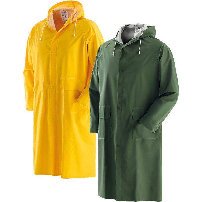 Tessuto impermeabile bispalmato in PVC/ poliestere/ PVC. Cappuccio fisso con cordino, chiusura con bottoni.
