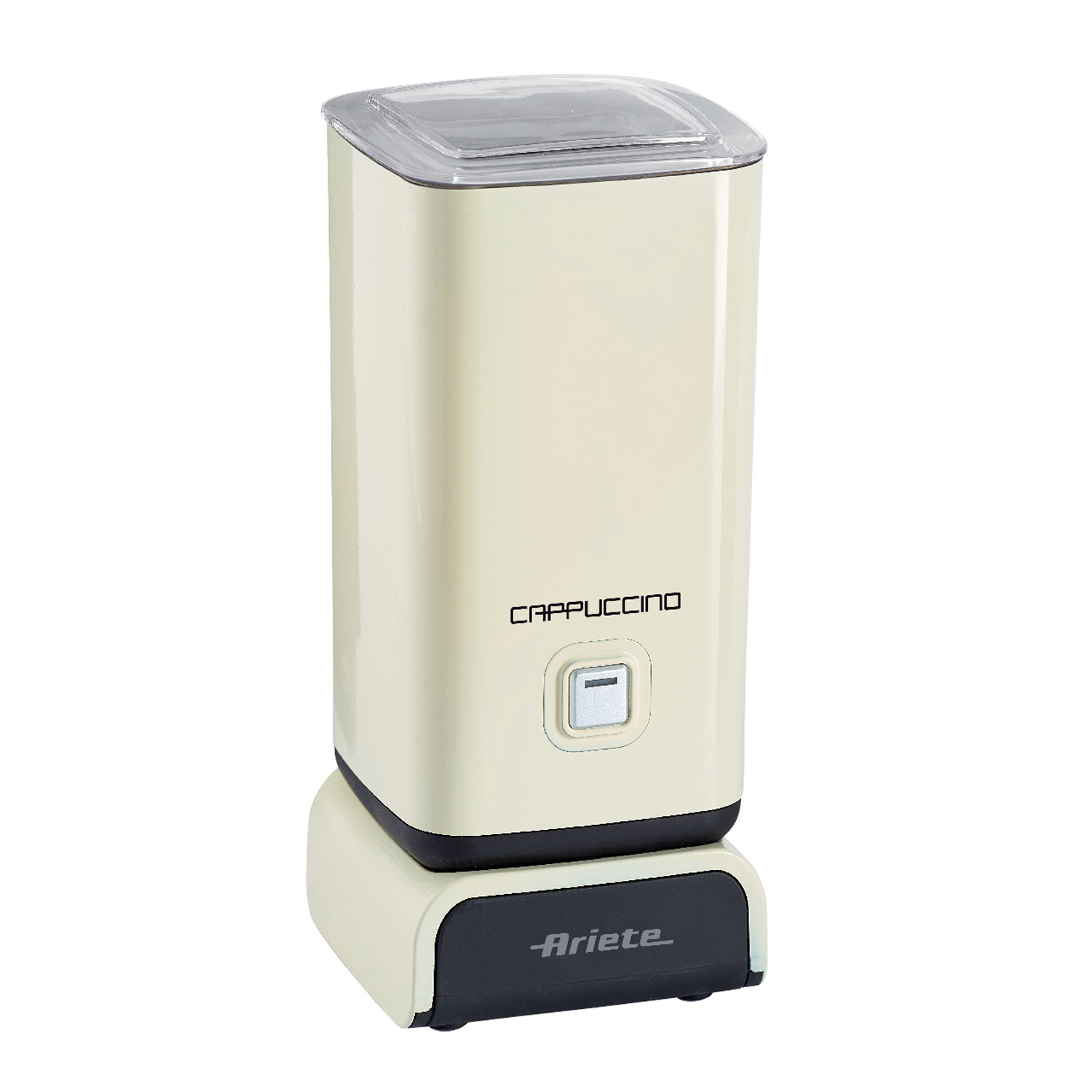 Il Cappuccinatore della linea Vintage di Ariete ti permette di preparare cremosi cappuccini in tutta facilità e quando vuoi. Grazie al montalatte elettrico potrai preparare in soli 2 minuti una schiuma di latte calda o fredda schiacciando un solo pulsante. Insieme al pratico accessorio per montare il latte, troverai anche quello per mescolare gli ingredienti che preferisci per creare gustosi smoothie e frullati di frutta e verdura. Per la pulizia non utilizzare alcun detergente chimico, abrasivo o aggressivo. Capacità: 0.25 litri. Potenza: 500 W. Dimensioni: 9,5x9,5x22 cm.