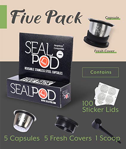 Capsule riutilizzabili per Nespresso: capsule Sealpod ricaricabili in acciaio inox per macchine Nespresso (compatibili con i modelli OriginalLine) - Design brevettato - Include 5 capsule, coperchi per espresso
