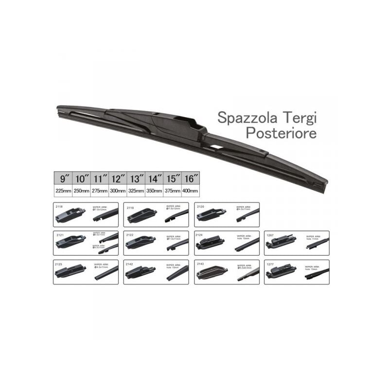 Marca CARALL,Modello T300,Universale Tutta Gomma Flessibile,Con 10 Adattatori Connettori Attacchi Raccordi,Compatibile con il 90% di auto in commercio delle spazzole tergi posteriore UNA SPAZZOLA TERGICRISTALLO POSTERIORE "AERO-FLAT" -Modello T300- - MISURA: 9" POLLICI (225mm) - Marca CARALL - TUTTA GOMMA FLESSIBILE - UNIVERSALE con 10 adattatori - -Compatibile con il 90% di auto in commercio- Informazioni Utili: - Applicazione:Tergi Posteriore - Modello: T300 - Misura: 9" - 225mm;