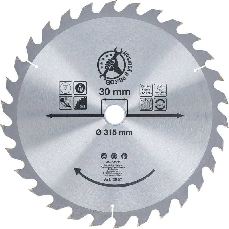 Certificazione MPA Denti in metallo duro Larghezza di taglio 3,0 mm Spessore della lama della sega 2,2 mm Imballaggio adatto per essere appeso alla parete Ja Peso del tessuto 1.3 Diametro del foro 30 mm Velocità max. 4200 U/min Diametro (C) 315 mm Denti 30 Dimensioni dell'imballaggio 1 Peso lordo 1300 g