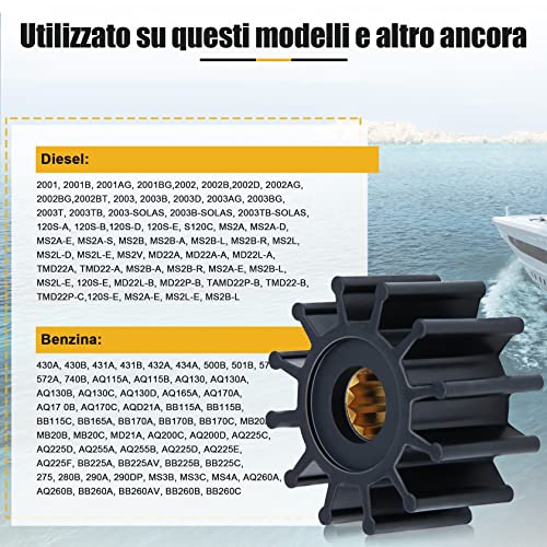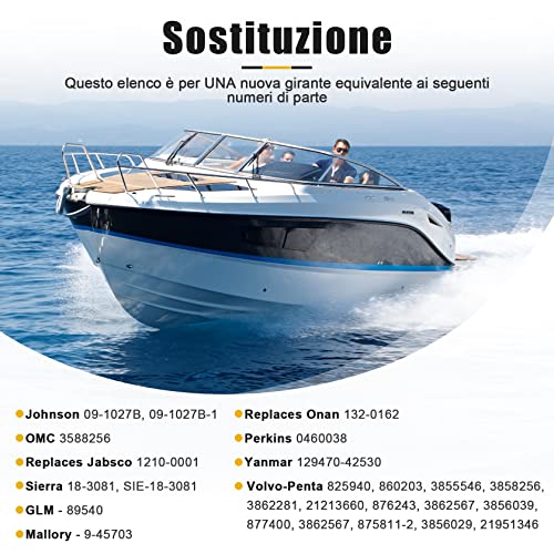 Girante sostituisce Jabsco 1210-0001, Johnson 09-1027B 09-1027B-1,OMC 3588256,Sierra 18-3081,SIE 18-3081,GLM 89540,Mallory 9-45703,Onan 132-0162,Perkins 0460038,Volvo-Penta 825940,860203,3855546,3858256,3862281,21213660,876243,38676243,38638638638676243,38638638638638638638676243,38638638638666,38666,876243,38676243,38638666,382567,3856039,877400,3862567,875811-2,3856029,21951346,Yanmar 129470-42530.