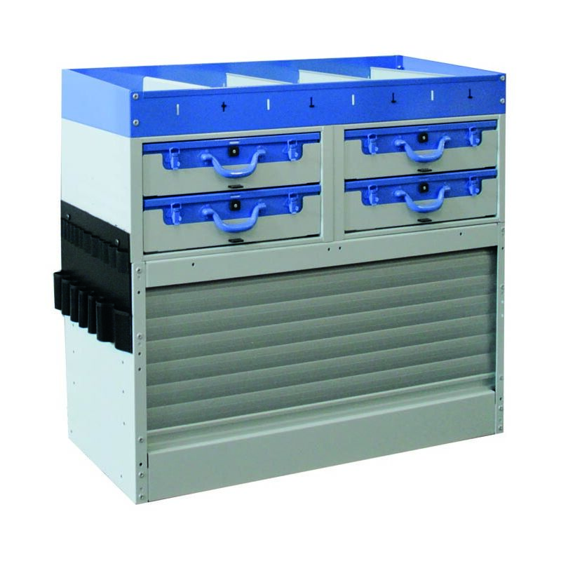 Composto da: n° 1 passaruota con serranda n° 2 moduli con 2 valigie n° 1 terminale con divisori n° 1 pannello portautensili Misura: L 1014 x P 360 x H 834 mm Peso: 54 kg