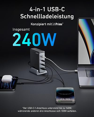 Caricab. USB-C Anker da 240 W, caricab. Anker GaNPrime, caricab. GaN compatto veloce 4 porte per MacBook Pro/Air, iPhone 14/Pro, iPad Pro, Dell XPS, Galaxy S23/S22, Note20, Pixel, Apple Watch e altro