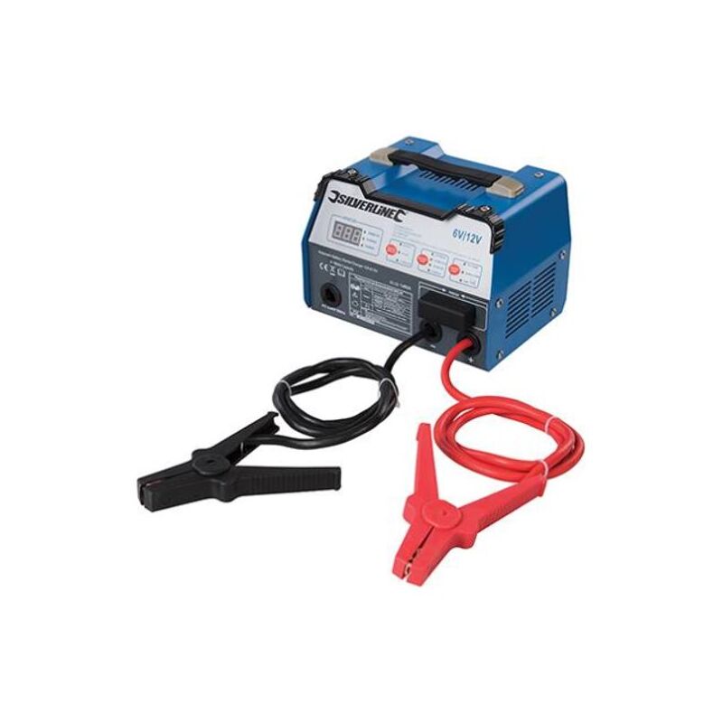 Caricabatteria e avviatore automatico intelligente per batterie di veicoli da 6/12 V. Per caricare batterie da 6/12 V a lungo ciclo, batterie per il tempo libero, normali batterie al piombo acido e batterie AGM/gel e le batterie possono essere caricate fuori o dentro al veicolo tramite carica veloce e carica di mantenimento. Morsetti incorporati per una connessione alla batteria facile e veloce. Dotato di una modalità di avviamento per supportare l'avviamento in caso di batteria debole o scariche. Il microprocessore intelligente rileva la percentuale di carica della batteria e l'efficienza dell'alternatore in maniera automatica. Morsetti ad alta resistenza, completamente in metallo, manico per il trasporto e istruzioni.