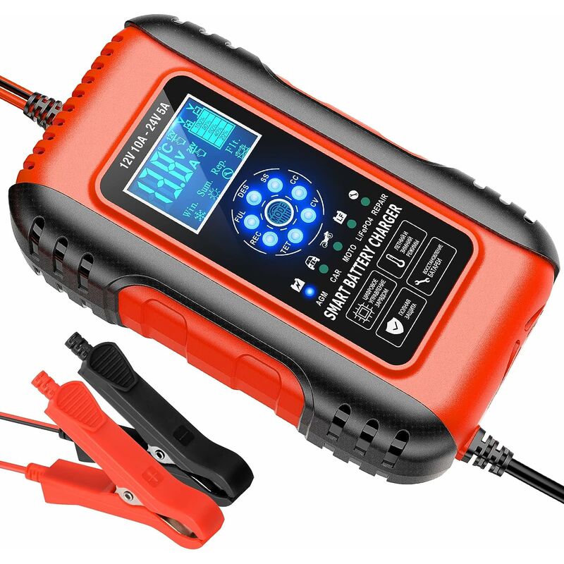 Gamma d'area: batterie per auto È adatto per batterie al piombo-acido da 12V 10A. e batterie start-stop. Il caricabatterie per auto supporta un ingresso di alimentazione 110-265, può facilmente far fronte a vari ambienticeppi duri e ha una lunga durata. È la scelta migliore per prolungare la vita della tua auto, camion, moto, tosaerba o barca. Display LED: controllo touch screen, scorrimento dati. Il caricabatterie per auto può passare liberamente tra più modalità, ricarica normale e doppia modalità. Il portabatteria per moto ha un display a cristalli liquidi.Puoi conoscere la tensione, la corrente, la temperatura e la potenza residua di questo kit di ricarica in qualsiasi momento. Puoi prestare molta attenzione al tuo livello di energia per vedere se hai bisogno di ricaricarti. Funzione di rilevamento e riparazione intelligente: il caricabatterie per auto non solo rileva l'alimentazione e si spegne automaticamente quando è completamente carico, ma è anche in grado di rilevare i