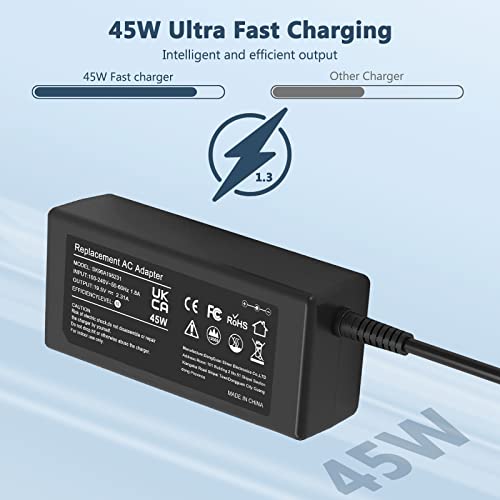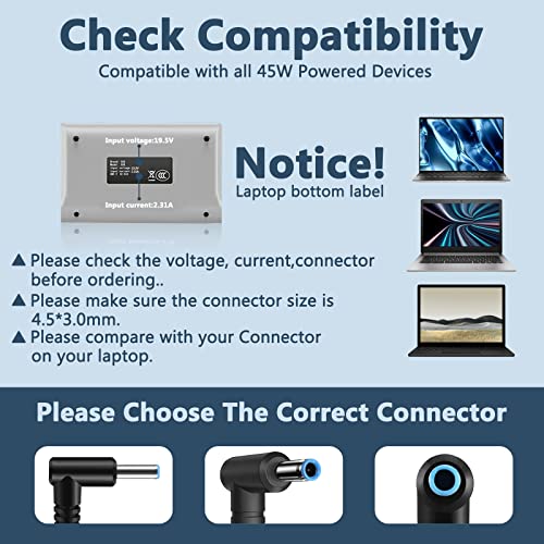 Campo di tensione in ingresso: 100-240V, uscita: 19.5V 2.31A 45w,connettore: Φ4,5 * Φ3.0 mm. La lunghezza totale del cavo: 2.8M (Facile da trasportare)! Standard CE e RoHS certificati. Rimborsabile entro 30 giorni, e garanzia di 1 anni