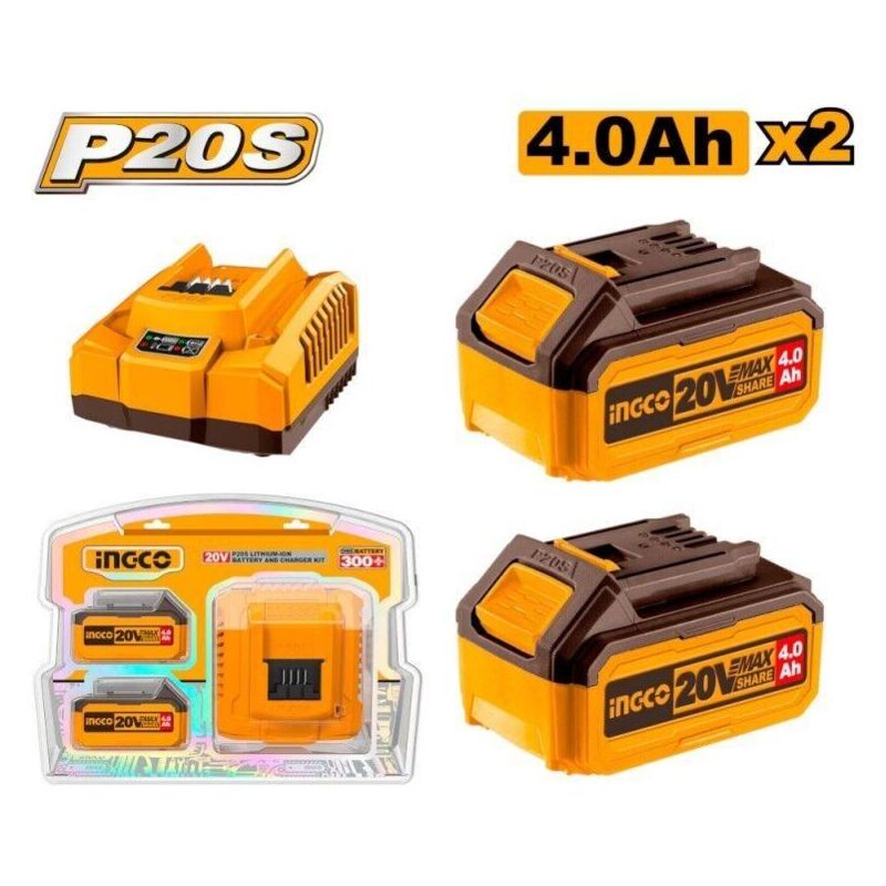BATTERIE - 20V 4Ah Tensione: 20V Batteria agli ioni di litio da 4.0 Ah Indicatore di carica a LED Si adatta a tutti gli strumenti multipli INGCO 20V Imballato in scatola CARICABATTERIE - 20V 110V-240V Tensione di ingresso nominale: 110 V-240 V ~ 50/60 Hz Voltaggio in uscita: 20V Corrente di carica: 4A Potenza in ingresso nominale: 50W Ricarica batteria da 20V 4.0 Ah in 1 ora Imballato in scatola appendibile