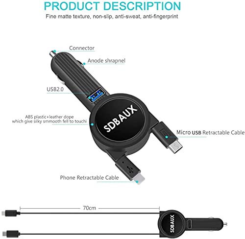 Caricabatteria da Auto, SDBAUX Quick Charge (3.1A/15W) con Doppio Cavo Retrattile 70 cm Compatible iPad iPod Phone 5s 6 Plus 7 8 X XS Max XR, Samsung S6 S5 Tab 4 LG Google Nexus10 e 1 porta USB