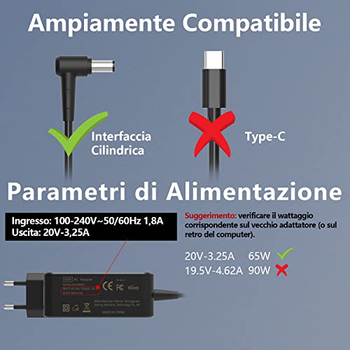 【Parametro del prodotto】 Ingresso: 100-240 V 50/60 Hz 1,8 A Uscita: 20 V-3,25 A 65 W (Compatibile con 45W) Tipo applicabile: può supportare la maggior parte dei dispositivi elettronici come computer notebook e tablet con la stessa interfaccia specifica per la ricarica