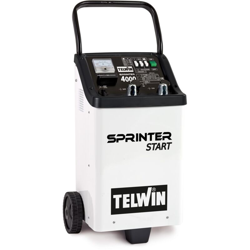 Il caricabatterie avviatore Telwin Sprinter 4000 Start è un apparecchio molto valido per caricare accumulatori al piombo (WET(START-STOP) con tensione 12/24V e avviare rapidamente auto, furgoni, imbarcazioni, trattori e autocarri di piccola e media cilindrata. Fa parte della nuova gamma di prodotti Elements che combina articoli adatti all'uso hobbistico e semiprofessionale, a prezzi e con prestazioni veramente eccezionali. La struttura è compatta, essenziale: due ruote posteriori e una maniglia superiore molto ampia, integrata alla macchina in metallo, permettono lo spostamento su qualunque tipo di pavimento;